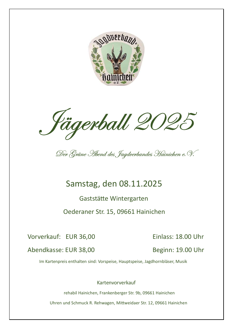 Wie auch in den vergangenen Jahren lädt der Jagdverband Hainichen e.V. herzlich zum Jägerball 2025 ein. Alle Interessierten sind willkommen – ob Jäger oder Nicht-Jäger – und wir freuen uns auf einen unterhaltsamen Abend voller Musik, Tanz und geselligem Beisammensein.